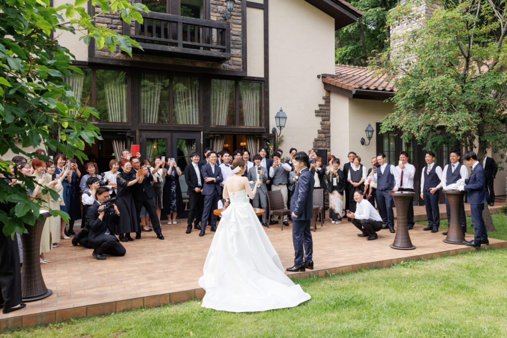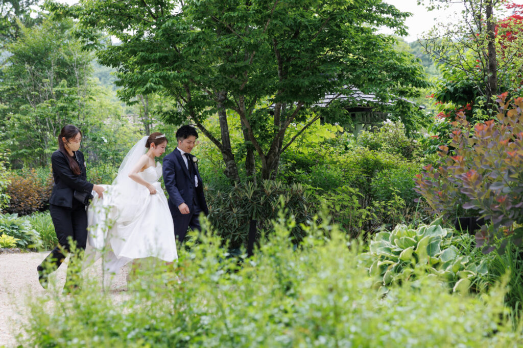 新緑の綺麗なガーデンに純白のウエディングドレス