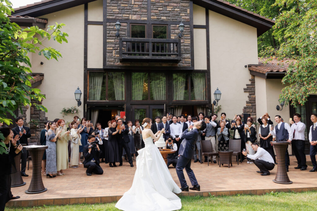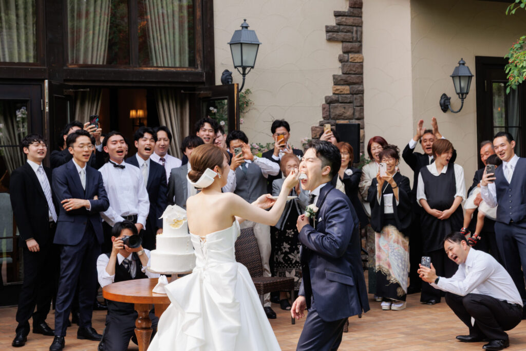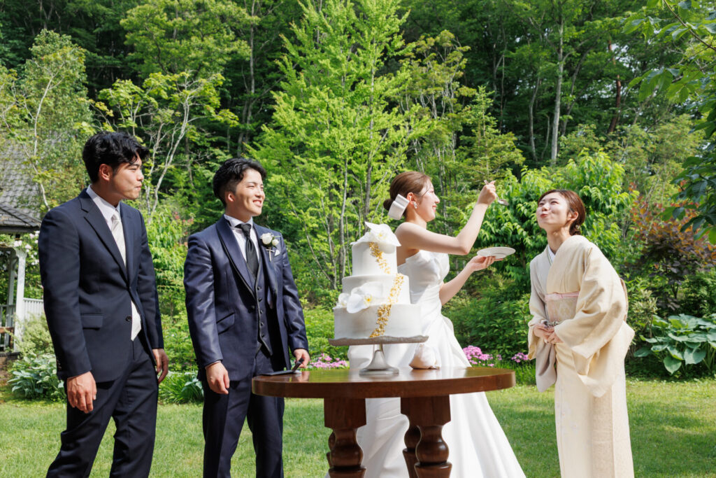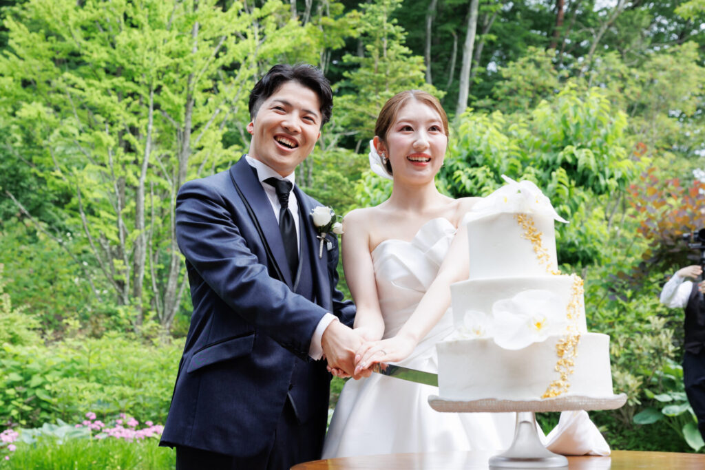 緑に囲まれたガーデンでのケーキ入刀は、忘れられない幸せなワンシーンに
