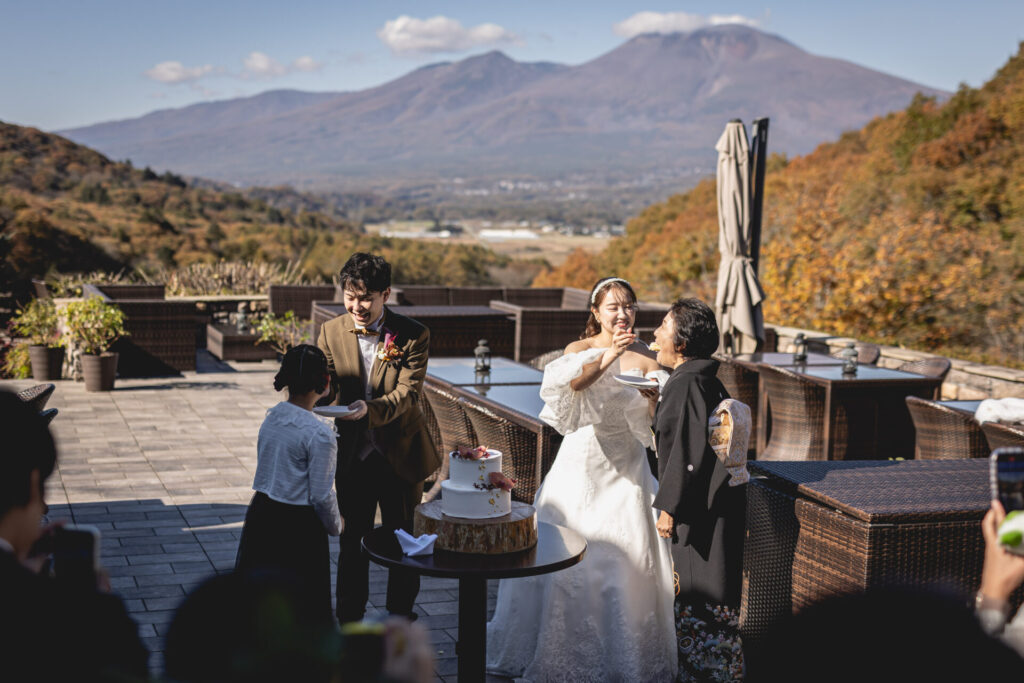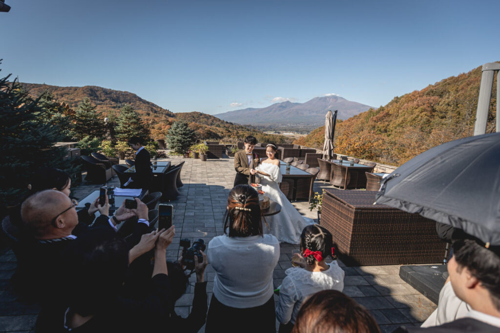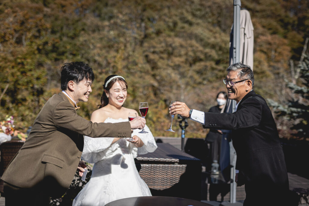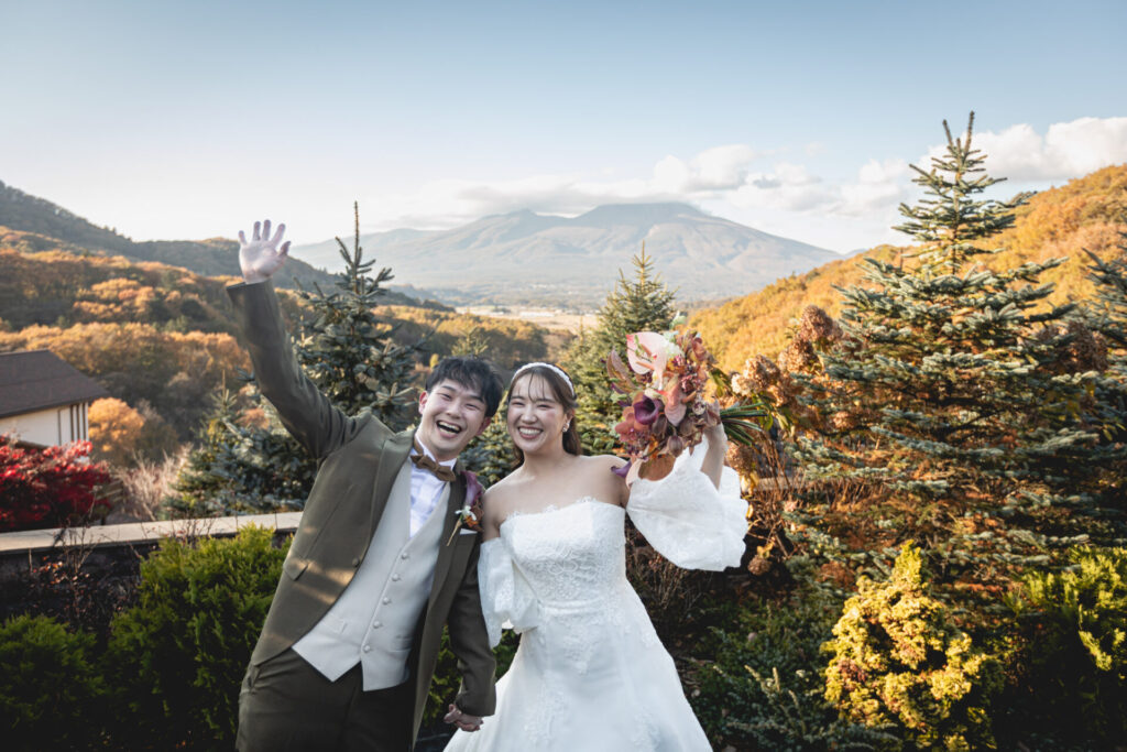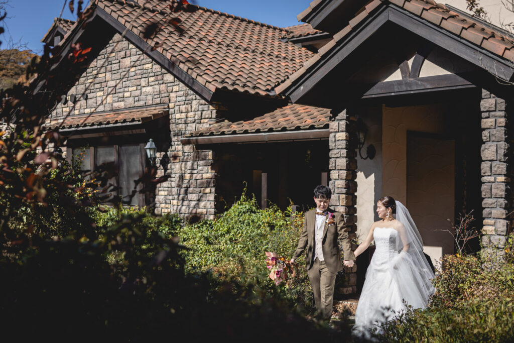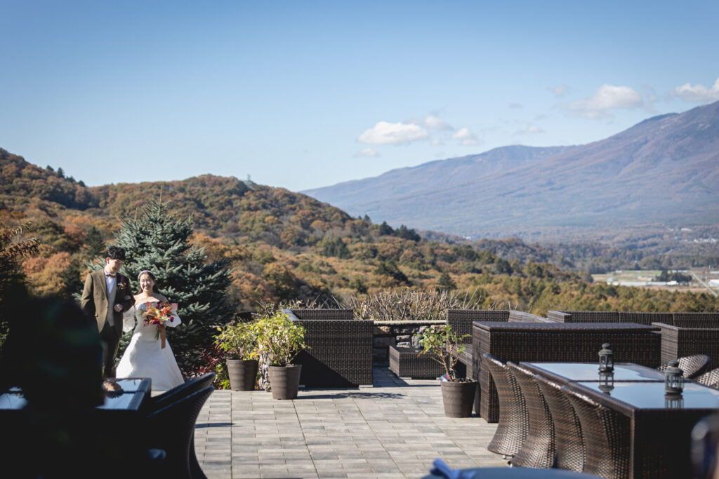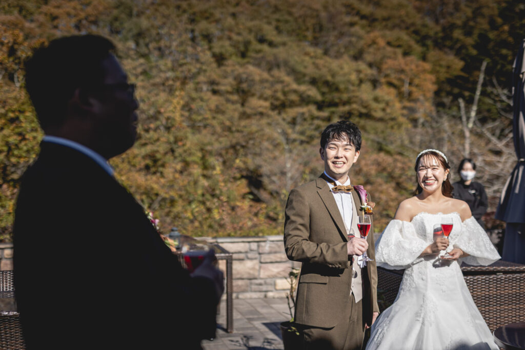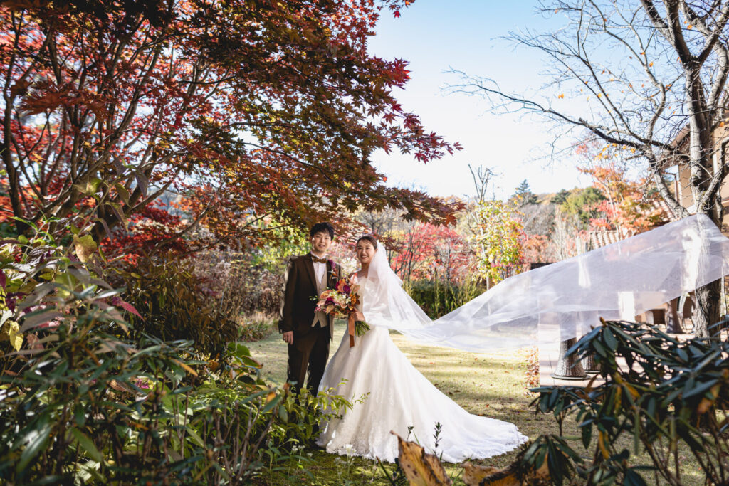 冬の訪れを感じる澄んだ空気の中、木々がほんのり色づく軽井沢ウエディング。